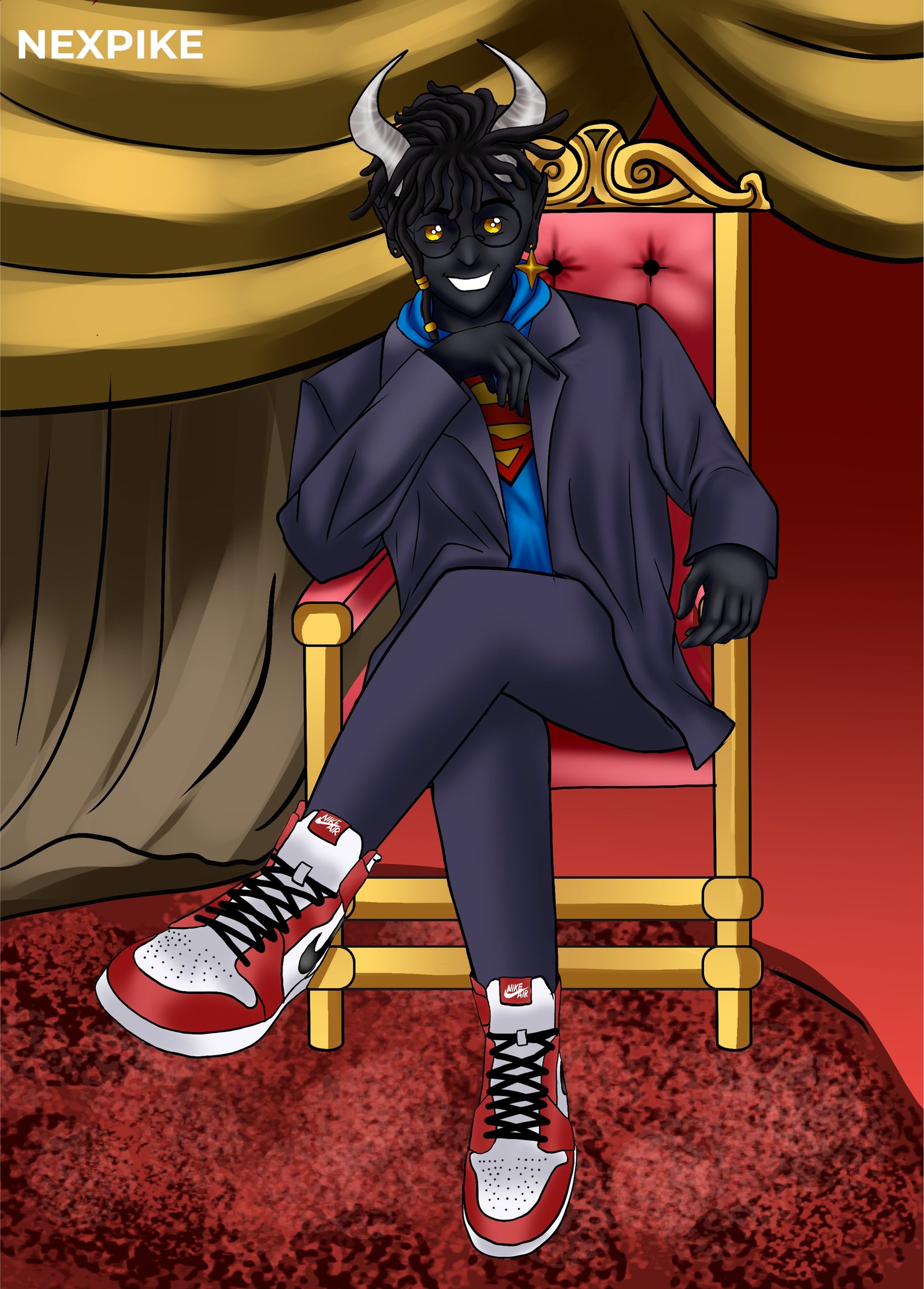 A modern demon prince with style and swagger, Lord Nyxar blends fantasy with street fashion. This full-body digital artwork showcases his sharp horns, glowing eyes, and bold outfit, seated on a royal throne with cinematic flair.