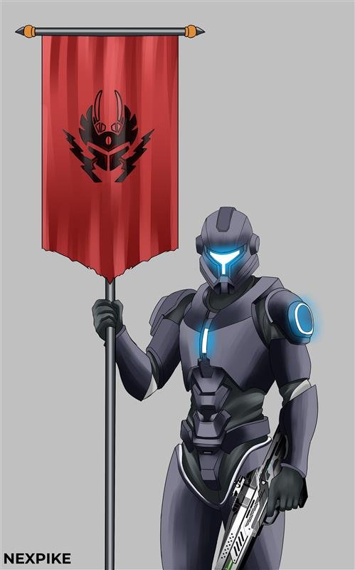 Sentinel Drayke stands guard beneath a war banner, armed and battle-ready. This sci-fi warrior piece captures a moment of strength and allegiance, ideal for use in stories, covers, or promotional visuals.